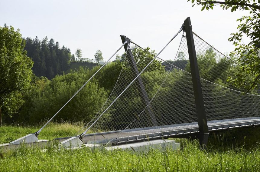 Poprvé je most zavěšen na drátěném pletivu místo obvyklých závěsných lan .